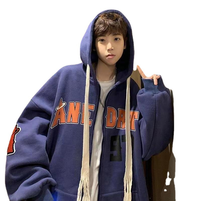Featuring a stand collar, zip-up placket, and side seam pockets, this straight-fit cardigan provides both functionality and streetwear appeal. The subtle printed design elements add a trendy edge, while the hooded design and fleece-lined interior deliver added comfort across all four seasons.
